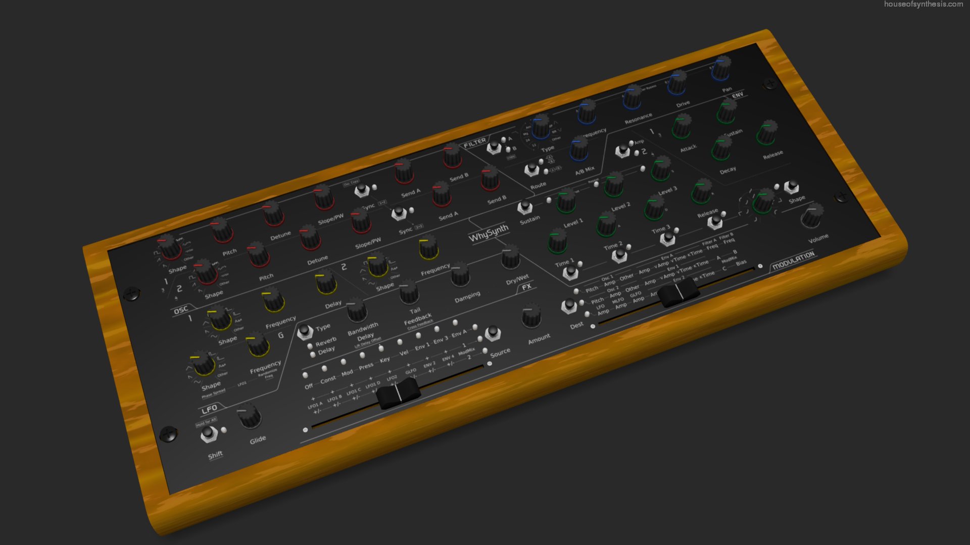In light of these requirements, I chose WhySynth. As mentioned on it's web page, the GUI is rather dull. This is a shame as the synthesis engine behind it is really quite versatile, equal to and in some cases better than commercial synthesizers. So hopefully I can rectify this problem, at least in hardware, by giving it a tweakable, hands-on physical interface. The 3D model that I've created may also help to improve the GUI at some stage.