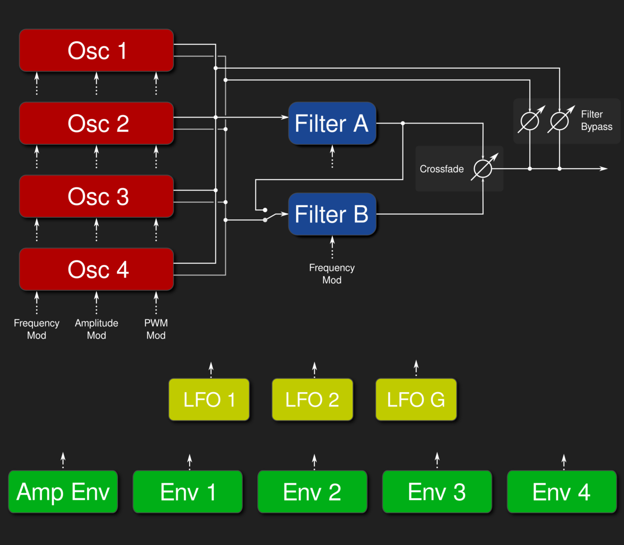 This diagram is simplified to emphasize the routing available when using the controller. This was done to both simplify the usage and reduce the number of controls required for filter routing. WhySynth is actually more flexible: