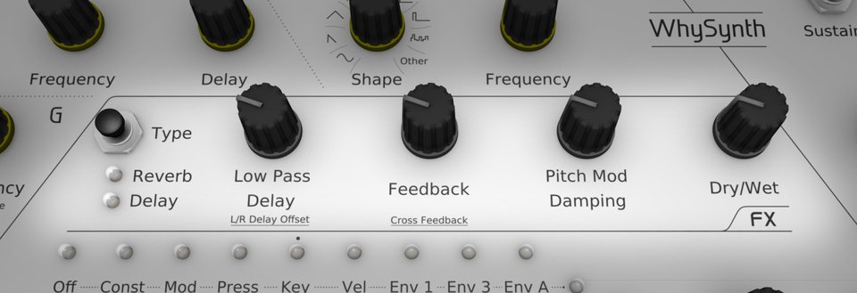 WhySynth currently has three effects available, with one active at a time. These are a stereo delay, a plate reverb and a regular reverb. The type button cycles between these. The plate reverb is active when both LEDs are illuminated. Since the delay and reverbs have different parameters, some controls have two labels, one for the reverbs and one for the delay. The delay is stereo, with two shifted parameters: the offset between left and right delays and the amount of cross feedback.