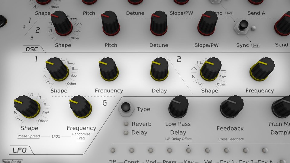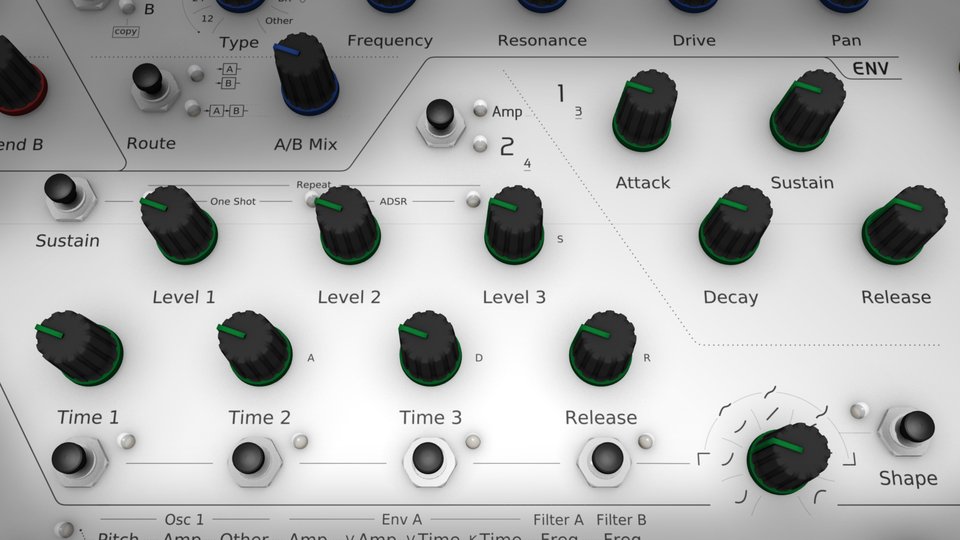 Looking around the panel, you'll see that a second set of oscillators (3 & 4), a second set of envelopes (3 & 4), and a few other less used controls are available in shift mode. Note that all other controls still function normally while in shift mode.