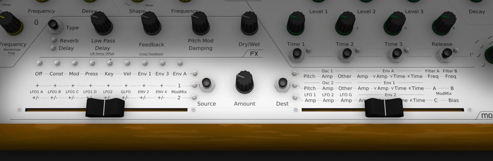 WhySynth's modulation is a little bit different to most synthesizers. Rather than a series of virtual patch leads, each modulation destination can have it's own source. This means that there are effectively as many 'patch leads' as there are modulation destinations, of which there are many. So instead of selecting a virtual patch lead to edit, you simply select which modulation destination you want to edit with the right slider. You then use the left slider to select which source will modulate the selected destination. The amount control determines how much modulation takes place and, in most cases, if the modulation is positive or negative.