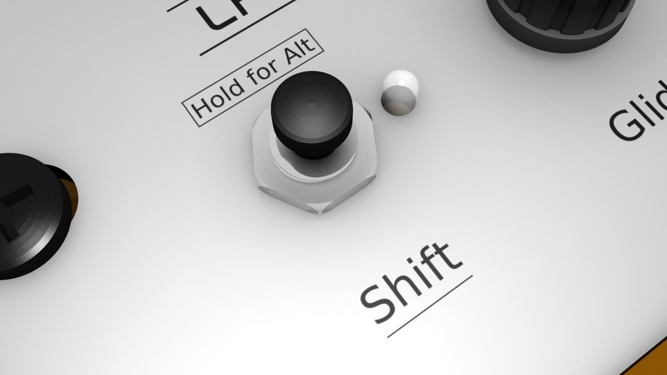 The first is a shift mode, enabled by pressing the shift button. The LED next to the shift button is illuminated when in shift mode. The 'Shift' label under the button is underlined, this being a visual cue to remind you that any underlined labels refer to the shifted function of a control.